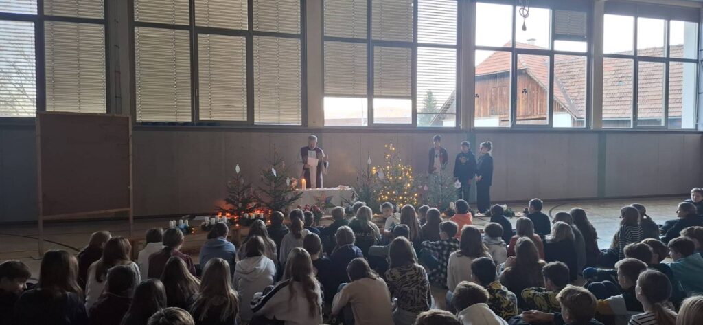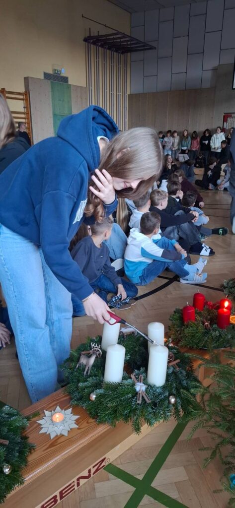Am 28. November fand an unserer Schule die Adventkranzweihe statt und markierte den stimmungsvollen Auftakt in die bevorstehende Weihnachtszeit. Unter dem Motto „Zünde ein Licht an“ versammelten sich Schülerinnen, Schüler und Lehrpersonen mit den geschmückten Klassenadventskränzen im Turnsaal. Dort wurden die Kränze von Herrn Pfarrer Mag. Schwingenschuh feierlich gesegnet. Musikalisch umrahmt wurde die Andacht durch Beiträge des Schulchors sowie durch ausgewählte Schülerinnen und Schüler, die mit Liedern und Texten zur besinnlichen Atmosphäre beitrugen.