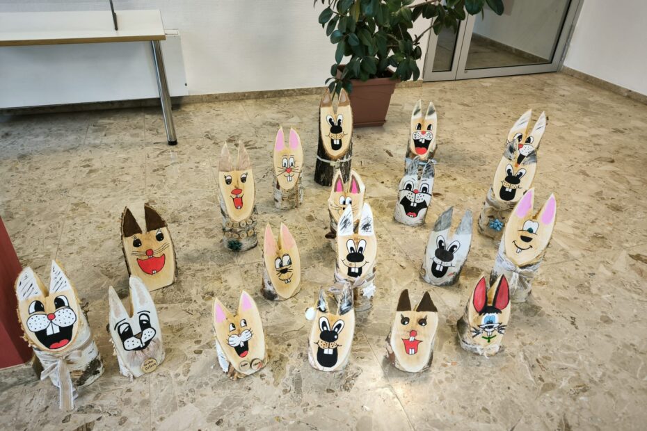 Unsere Schulwartin hat mit den Kindern der Frühbetreuung bunte Osterhasen aus Holz gestaltet. Die Osterhasen wurden mit viel Freude, Einsatz und Farbe bunt gestaltet. Die Hasen verbringen die Wartezeit bis Ostern nun im Eingangsbereich der Schule und sorgen so für Osterstimmung.
